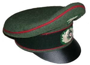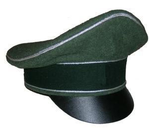 Field gray wool body with Green piping, leather visor, bevo silver cap eagle and cocarde. |