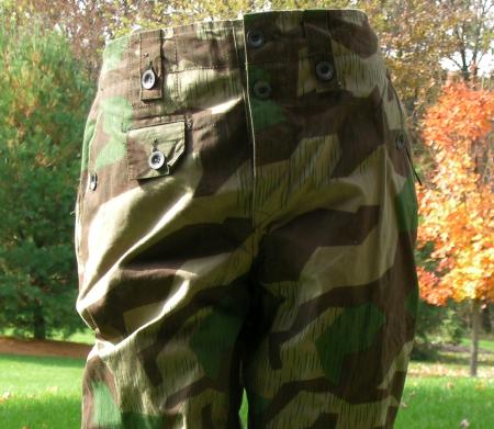WW2 splinter pattern pants.Fall side out.These pants are straight leg and have 2 adjustable side belts,4 belt loops, suspender buttons, 2 front slash pockets with button closure, 1 rear pocket with button closure, 1 watch pocket with button closure, and partial lining. $39.95 SALE |