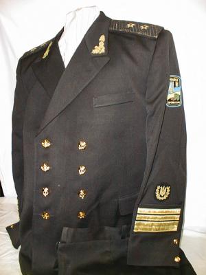 UK7.Ukrainian 3-star Admirals black everyday uniform.Jacket, pants,hat.Jacket has embroidered anchor/leaves on collar,embroidered trident with wreath on each sleeve with admirals sleeve rank below.Shoulder boards are black with 3 embroidered stars.Pants are black.$650.00