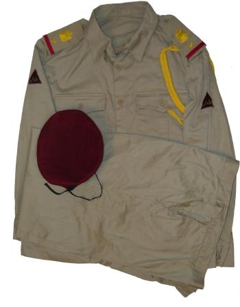 | IU15.Iraqi Army / Republican Guard tan desert color uniform. Jacket and pants. Size XL. Comes with sleeve patches, shoulder cord, beret size 58. Saddam era, Iraqi made. $225.00 |